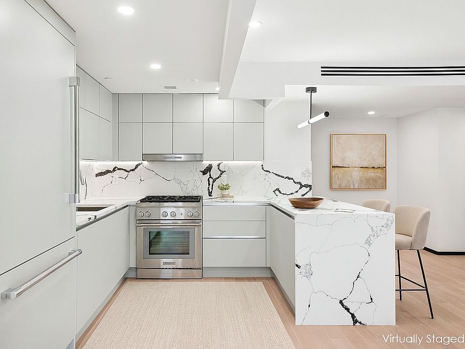 The custom designed kitchens boast Italian cabinets by Miton Cucine, adorned with stunning quartz countertops and a matching backsplash for a seamless aesthetic. Select units are enhanced by an Island. This home is equipped with top-of-the-line appliance packages, featuring a Thermador or Smeg range, hood, and refrigerator, alongside a Bosch or Miele dishwasher and Miele washer and dryer, seamlessly blending modern convenience with style. Select units feature an additional 15” Summit wine cooler, perfect for entertaining guests in style.