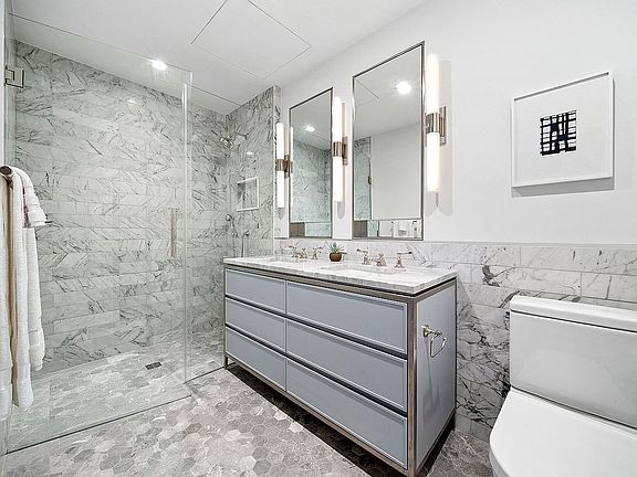 With 10' ceilings in the great room, one feels a sense of Edwardian grandeur throughout this oversized three-bedroom duplex home. The living room and two bedrooms overlook the picturesque cul-de-sac of West 71st Street, which is lined with beautiful prewar apartment houses and brownstones. Cooking is a pleasure in the open kitchen, which is outfitted with custom French Canadian cabinetry, Olympian Danby marble countertops and backsplashes, and Miele appliances. The stunning master bathroom features a custom vanity with honed Grigio Nicola marble countertops. The heated floor is comprised of honed Grigio Nicola hexagonal tile, while the walls are surfaced in honed statuary marble tile. Stylish Waterworks fixtures complete the picture. Storage Unit, Electric Blinds and Overheard lighting included.