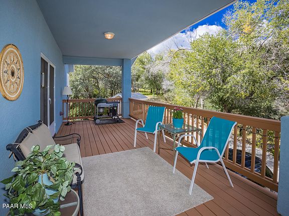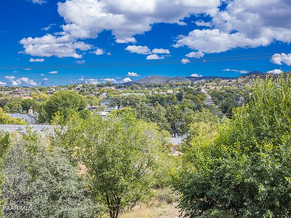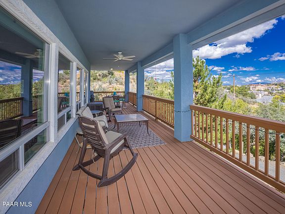 Located just three blocks from Prescott's historic Courthouse Square & Whiskey Row, this home boasts an elevated lot with panoramic views of the San Francisco Peaks, Glassford Hill, Mingus Mountain, and downtown city lights! The interior of the home showcases an open great room concept, soaring vaulted ceilings, skylights, and beautiful laminate wood flooring throughout. The elegant kitchen features custom raised panel cabinetry with new stainless-steel appliances, and a generously sized island that's perfect for entertaining or casual dining. There is also a massive walk-in pantry and a spacious dining area. The great room is well appointed with a floor-to-ceiling stack stone gas fireplace, and a wall of windows for abundant natural light and outstanding panoramic views. CONTINUE The large master suite showcases fabulous views of the mountains and city lights, a vaulted ceiling, and spacious walk-in closet. The full master bathroom provides a raised height vanity with low maintenance solid surface countertops, and a tub/shower combo. There are two guest bedrooms with vaulted ceilings, both with beautiful views looking out onto the boulder laid backyard with natural foliage. The guest bathroom has a raised height vanity and walk in shower. A large Arizona Room with mini-split heating/cooling adds more space and is perfect as a craft room/play area/flex space.The laundry room has a convenient folding desk, built-in storage, and a hanging rack. Downstairs is a massive, extra deep 4 car tandem garage with insulated overhead doors, as well as two extra storage spaces with built-in shelving. The tandem garage area is currently outfitted with a workshop that has added power and an exhaust fan. The home showcases an expansive wraparound covered deck that is perfect for entertaining and enjoying the outstanding views surrounding the property. Meandering pathways, boulder outcroppings, bountiful mature trees, natural forest foliage and low maintenance drip irrigation enhance the setting. Additional features include a fenced dog run area, an 8x10 storage shed and a 40-gallon water heater with recirculating pump.