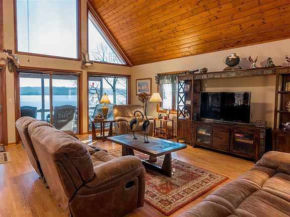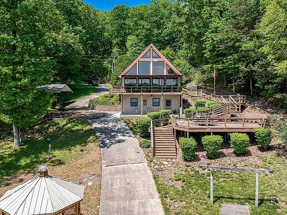 JUST BRING YOUR BOAT AND TOOTHBRUSH!! Escape to the lake in this contemporary A frame 3 bedroom/3 bath home. Rare opportunity to own this piece of paradise! This lake beauty is offered completely furnished down to the linens. Sellers spared no expense to make this turn-key destination self-sufficient. Outdoor decks are composite, furniture is comfortable and maintenance friendly. Back up home generator gives peace of mind. The floor to ceiling windows on the main floor bring the outside in, a truly magnificent mile wide main channel view across to TVA's Sandy Bottoms preserve'watch the VOL Navy sail up river! Nature lovers will enjoy the deer, heron and lake wildlife that have taken up residence here. Open and airy with vaulted ceilings, the main floor has kitchen combo dining, 2 queen beds, a full bath and a large laundry room and storage area right off the kitchen. Upstairs is a king bed and trundle bed and large bath. Downstairs is a bunk room and bath, perfect for teens and offers plenty of storage with an attached garage. This is a home for all ages with a gentle slope to year round water and your own private boat ramp. Large carports and generous concrete driveways allow for plenty of parking. Large private dock with 2 Hydraulic Jet Ski lifts. The perennial gardens and lawn with gazebo and decks galore offer private outdoor enjoyment for everyone. Great swimming area at your own beach.