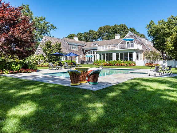 Luxurious, fully furnished at exclusive Oyster Harbors Club, Cape Cod; Thoughtful 2021 major renovation. Deeded beach and docking privileges; Appreciate the highest standard of excellence that enhances this home's comfort and function. There are 5 bedrooms, 51/2 bathrooms. 2-story great room with balcony that showcases the top of the line kitchen & living area with gas fireplace & access to an outdoor patio. There is a formal dining room and four-season sunroom serviced with a mini-split system. First floor has a primary bedroom suite with sumptuous bathroom, separate dressing room & study/sitting room; the second floor has two 'bedroom wings' with separate staircases; one wing has two bedrooms with private bathrooms, walk-in closets; The second guest/staff wing has two bedrooms, shared bathroom; private access to a spacious roof deck.The home is on a lovely corner lot with exquisite landscaping, (stunning hydrangeas!). wrap around front porch, heated pool, 3 car garage, two driveways. Move in ready.