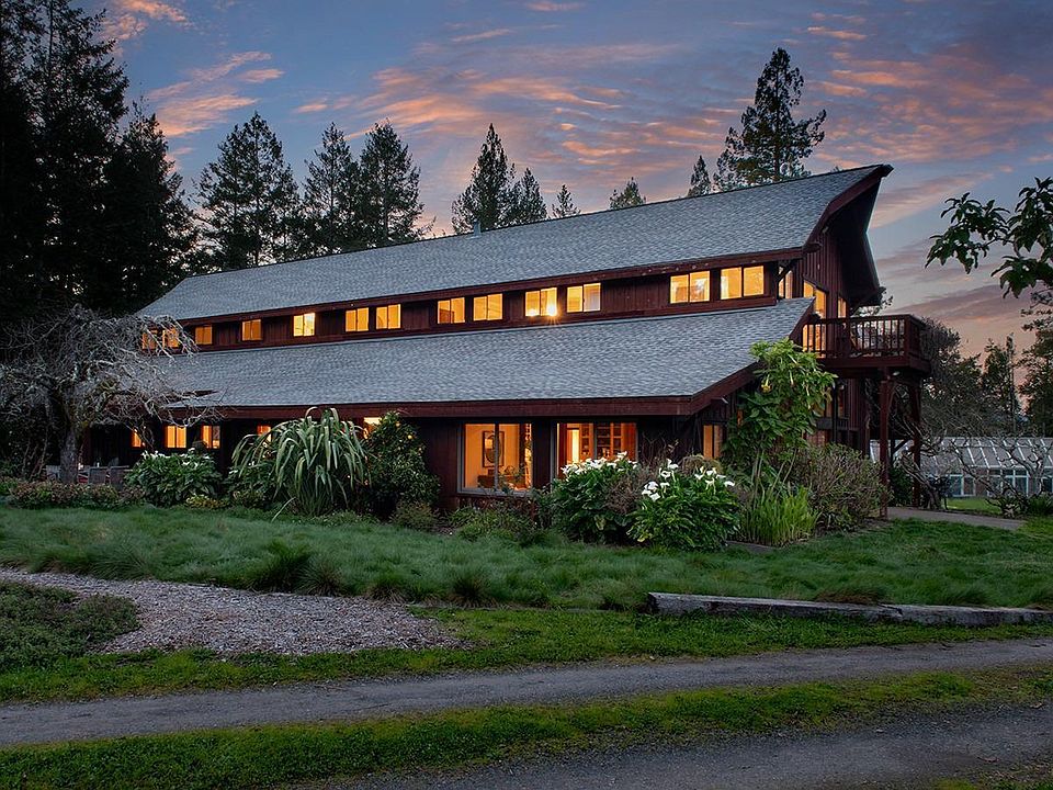 Here it is, a rare find and an opportunity to live in Sebastopol's heavenly Banana Belt microclimate! Enter through a private gate along the property's dreamy year-round rushing stream, which has become the pathway to a family of otters, who have made the property's tranquil and serene "stocked" lake their temporary home. Then meander up the hill through a pristine forest to the level to gently rolling 10+/- acre ridge top meadow where you will find a stylish "barn style" home with attractive board and batten siding and which boasts commanding ceilings, a chef's kitchen complete with a pizza oven, and a game room sized for the largest of gatherings. The attractive primary suite features its own deck/balcony that overlooks the property's rolling green pastureland and magnificent orchard that showcases dozens of varietal fruit trees from around the world, and a stunning 20 x 60 New England style white steel and glass greenhouse with automated roof vents. Nearby is the single-story 1 bedroom ADU with its tall ceilings and massive deck. Lovingly named "100 Acre Wood", there are miles of improved trails where Winnie the Pooh and his friends are honored with the trails bearing their names. This is complete peace and privacy in West Sonoma County Wine Country.