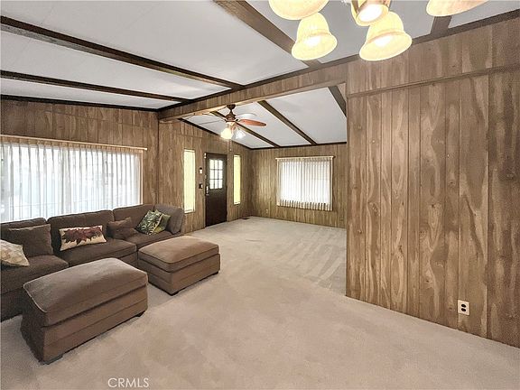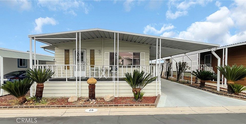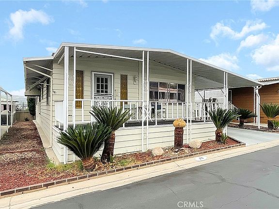 A charming 2 bedroom and 2 bathroom home is waiting for you at Villa Magnolia, a 55+ Gated Community located in the city of Riverside. The entrance into the home is from a front porch with absolutely Beautiful views of the mountains. Once inside the home, you are greeted with a spacious living room that extends to the dining area. The kitchen is steps away and opens up to a room that can be used as an office/study, family room, or additional dining area. The kitchen appliances include: a new refrigerator, new dishwasher, built-in oven, and built-in cooktop. As you make your way through the home you will find the nicely sized bedrooms. The primary bedroom has a connecting bathroom with double vanity sinks, a walk-in shower, and a separate bathtub. The guest bedroom also has direct access to the guest bathroom which has a walk-in shower and linen closets. The home also has a laundry room (includes a full-size washer and dryer), A/C Unit, Heating, and a Storage Shed. This home is Move-In Ready. For the Price, You Cannot Miss Out On This One!