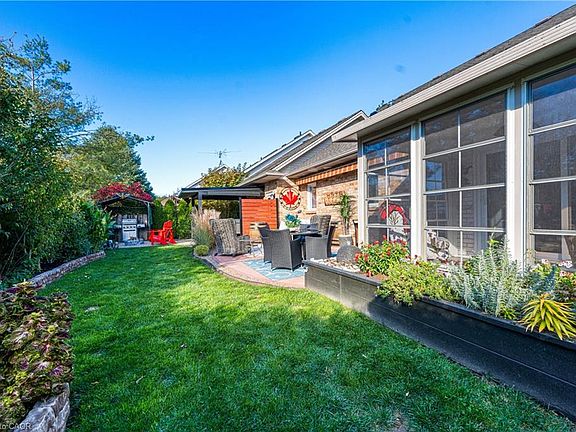 STUNNING OVER-1900 SQ FT BUNGALOFT BACKING ONTO PEACEFUL GREENSPACE IN THE HEART OF NIAGARA’S WINE COUNTRY Enjoy relaxed, elevated living in this beautifully updated 2+2 bedroom bungaloft set in an extremely quiet area with no rear neighbours. Surrounded by award-winning wineries, great restaurants, boutique shops, and the scenic trails of Balls Falls Conservation Area, this home places the best of Niagara right around the corner. Perfect for empty nesters or retirees, you can also access the Heritage Village community centre for a small annual fee, giving you an indoor heated saltwater pool, fitness facilities, games rooms, and vibrant social spaces that enrich everyday life. Thoughtfully updated throughout, the home features renewed windows and doors, custom shades, renovated baths, a refreshed kitchen, upgraded mechanicals, full interior painting, enhanced sunroom finishes, concrete patio work, and a massive retractable awning for outdoor comfort. The main level blends warmth and function with soaring ceilings, hardwood floors, a gas fireplace, and a welcoming open flow. The kitchen includes stone countertops and a large island, while the bright second bedroom connects to the sunroom—ideal for quiet mornings. The primary suite includes a walk-in closet and private 3-piece ensuite. The spacious loft adds meaningful flexibility with room for a second living area, reading, games, or hobbies, plus a custom live-edge desk for a beautiful workspace. The fully finished lower level includes two generous bedrooms, a full bathroom, and a large rec room—great for guests, hobbies, or added living space. Outside, unwind in your private backyard oasis with lush gardens, a large patio, fire pit area, pergola-covered hot tub, and a massive retractable awning, all set against peaceful green space. If you’re seeking updated main-floor living, quiet surroundings, and the full Niagara lifestyle, this home delivers it all.