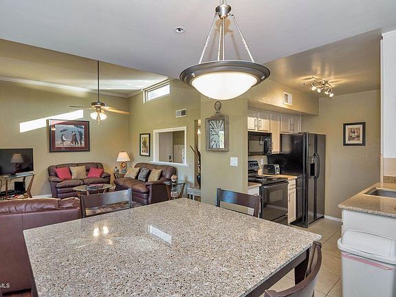 Right outside your door are paved biking and walking trails through the city of Old Town Scottsdale which offers world-class shopping, art galleries, spring training baseball games, wonderful restaurants, and exciting night life. Totally Remodeled, Fully Furnished 2 Bedroom 1 Bath Golf Course Condo. New Kitchen with Granite Counters. AC unit and water heater is only 3 years old! Dual pane windows, new french doors! Two heated pools, state of the art Fitness Center, Yoga Room, Private Movie Theater and Concierge Services.