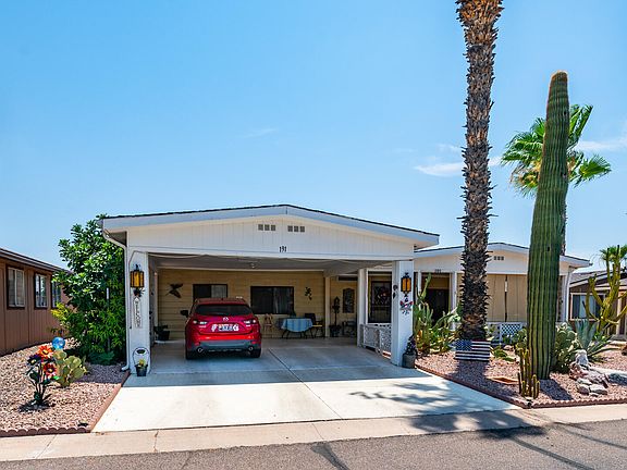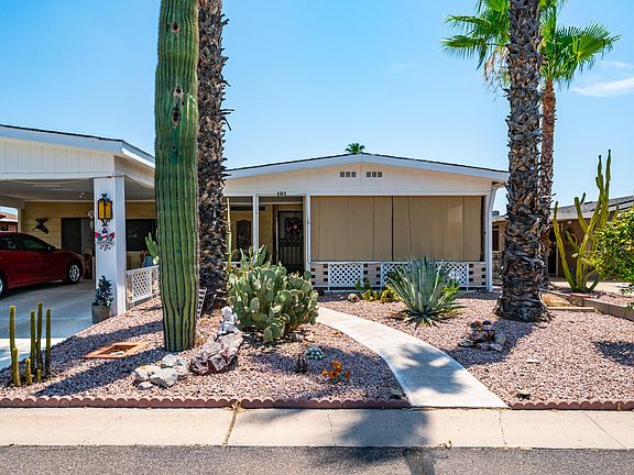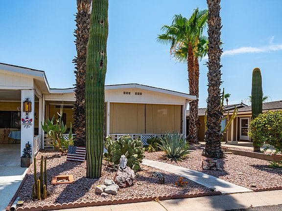 Whether you're seeking a year-round residence or a winter retreat, this is the home for you! Located in the vibrant active adult community of Apache East, this remarkable home offers the perfect setup to enjoy everything Arizona has to offer. This open and spacious, fully furnished home boasts a massive living room with a designated dining area, ideal for hosting family and friends. The expansive kitchen is perfectly equipped for preparing holiday feasts and everyday meals as well. The oversized main bedroom provides an abundance of space and features a full bathroom with double sinks, a garden tub, & a separate shower. Adjacent to the main bedroom, you'll find a private enclosed Arizona room, offering bonus space for relaxation or hobbies. The second bedroom is perfect for guests & is complemented by another full bathroom, ensuring privacy & comfort for all. Step outside to a full-length covered front porch with stunning views of the Superstition Mountains, as well as a covered back porch for more private outdoor moments. Location is everything, and this north-south facing home couldn't be better situated. It's right across the street from the clubhouse, pool, hot tub, shuffleboard courts, & loads of activities. This home truly has it all. Don't miss the opportunity to make it yours and start living the Arizona dream!