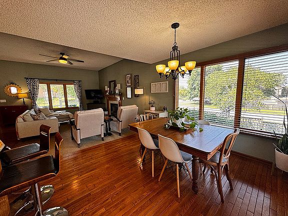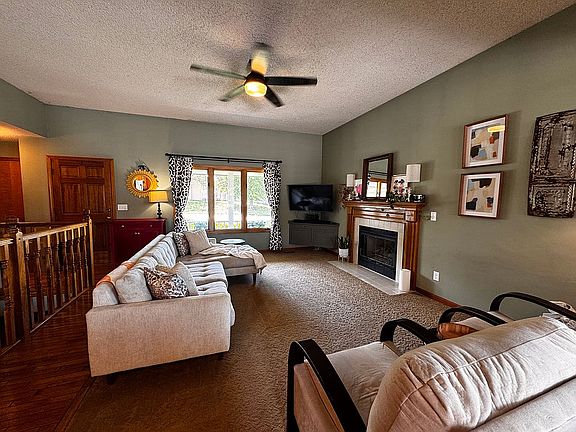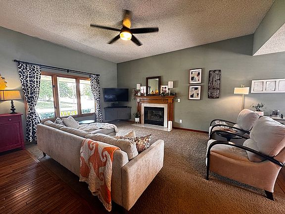 Inside, the open floor plan creates a bright and welcoming space with hardwood floors in the kitchen, dining area, and hallway. The kitchen offers granite countertops, a large center island, and stainless steel appliances that stay, making it move-in ready and ideal for entertaining. The spacious living room includes a gas fireplace and matching textured carpet that extends seamlessly into all bedrooms, creating a warm and cohesive feel throughout.