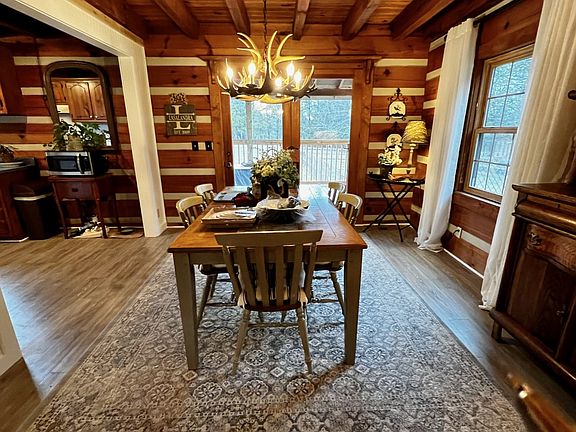 OPEN HOUSE CANCELED. Looking for a cozy, custom log home with a true rocking chair front porch? How about a peaceful setting nestled on 5 acres? With over $60K in updates & upgrades, this property is just waiting for you to make it your own! NEW kitchen quartz counters, windows, HVAC, flooring, light fixtures, paint, fencing, stove and new quartz counters! Spacious rooms with primary suite on main level. Covered back deck to enjoy the beautiful property. Extensive work on driveway and landscaping. Second building (approx 880sf) is roughed in & ready for finishing touches (potential rental or Airbnb, in-law suite, workshop, etc.)