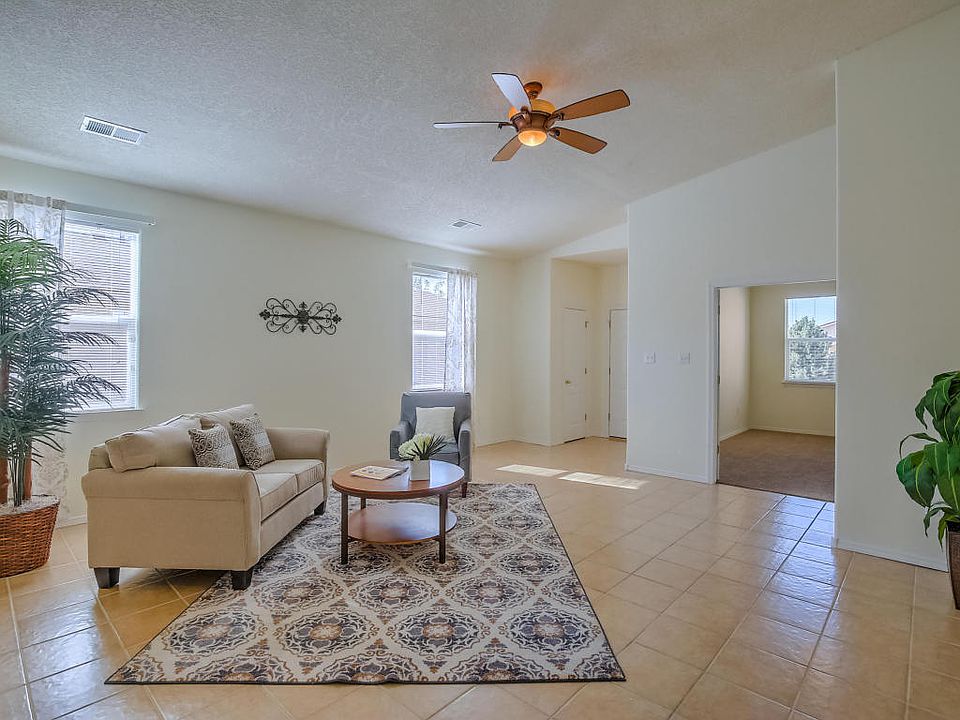 Immaculate Move-In Ready Home! Great open living area, tile floors with kitchen and dining room. Nice high raised ceilings give that spacious feel. Brand new paint and carpet, ready to move in. This 3 bedroom home includes an office/study/flex room/possible 4th bedroom. Master bedroom includes a full master bath with garden tub, separate shower and walk in closet. Enjoy refrigerated air, thermal windows and a large highly desired 3 car garage. Walled back yard also features a gated area for pets if needed. Home is located close ti I25 and all ammenities. Don't miss this great opportunity!