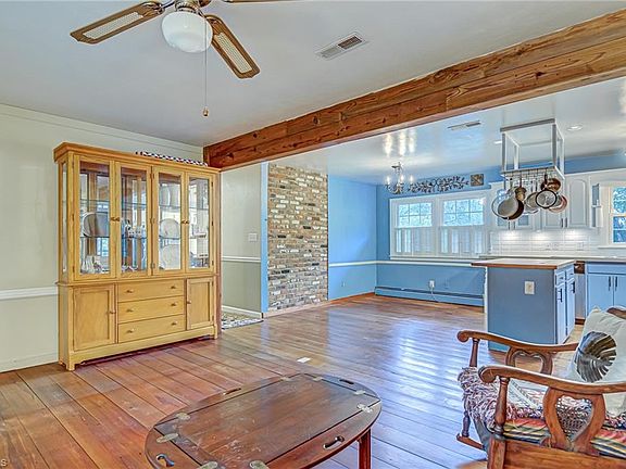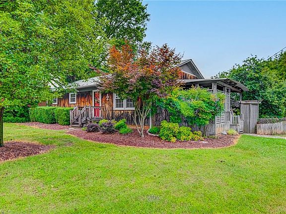 With its striking wood and brick exterior, metal roof & enclosed side porch, this residence exudes timeless appeal! Open plan kitchen, dining, and living area create a seamless flow. Wide plank wood floors create a warm, inviting atmosphere, with ceiling fan, chair rail, and crown molding. Kitchen boasts ample counterspace, cabinetry, a tile backsplash, and a convenient kitchen island. Primary bedroom features parquet wood floors, and en-suite half bath. The basement den is perfect for cozy evenings by the fire or playroom. Outside, large backyard with a paved driveway leading to the basement garage. 4-car carport, and storage building. Unique outdoor shower for rinsing off after a day of gardening or play. The privacy-fenced brick patio with a built-in gas grill is an ideal spot to enjoy the NC weather providing the perfect ambiance for outdoor gatherings. Don't miss the enchanting side porch- surely a tranquil spot to unwind! This home is a true gem! SEE AGENT ONLY REMARKS!