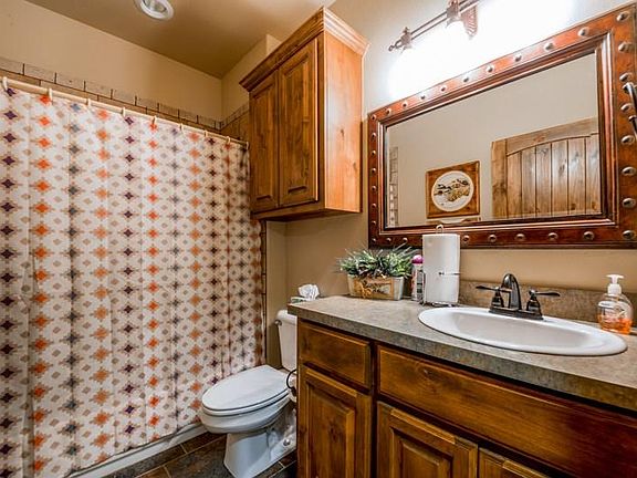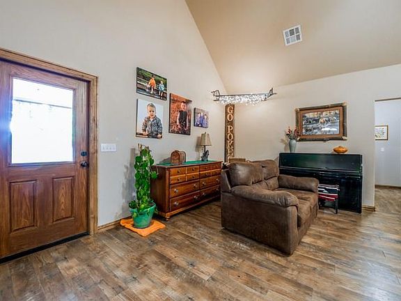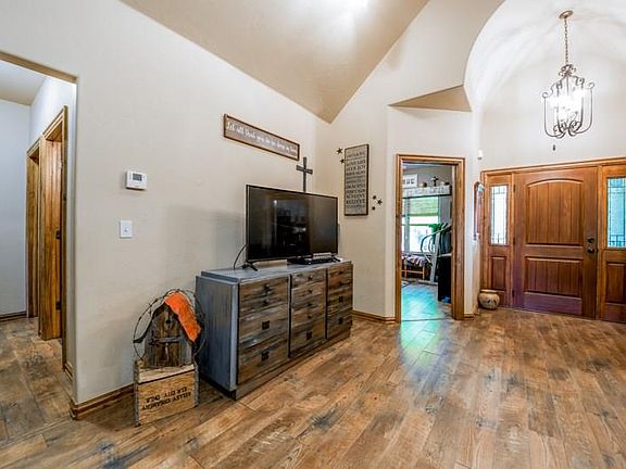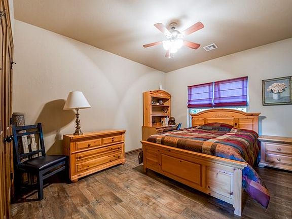 One of a kind home built by Jeff Gibbs with 45 acres, wooded and pasture, horse fence on part of it with piped fence for horse pens, outbuildings, storm shelter, mobile home hook up with own septic and lets not forget the spring fed pond which has been known to have bass in it. There is also a storm shelter on the land by the mobile home sit. Not to forget the other pond and creek bed that is wooded, garage/shop with electricity and concrete floor, butterfly garden rural water and thats just the outside. The inside features a pellet fireplace, two offices, sunroom, covered patio, nice size bedrooms, bonus room, living area is large with wood beam and wood flooring not to mention wood style baseboards and trim. Master has tray ceiling, walk in shower, master closet is also a safe room. Split floor plan has other to bedrooms with deep closets and bath on other side of the home. Foam insulation in walls.