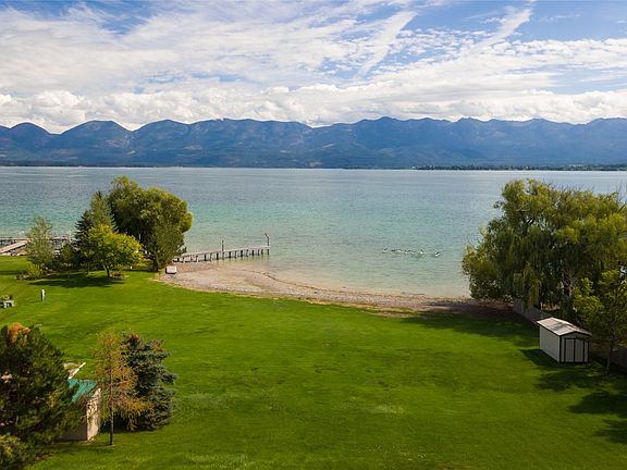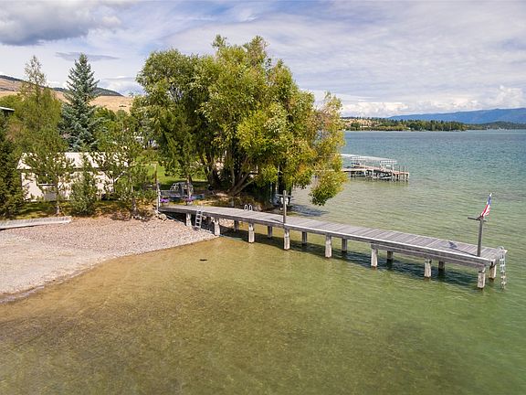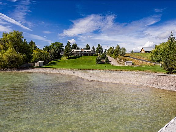 Are you looking for a lake home with plenty of room to roam, both inside and out? Visit this lovely lakefront offering! The property boasts 194 feet of pebble frontage, with a gentle lawn to lake slope on 1.9 acres. The home, which has an open easy flow and stunning wood features, offers 4 bedrooms, 2 of which are ensuite. There are massive living areas on both levels, and storage galore. The primary "wing" is on the main level, and separate from other bedrooms. Kitchen is open to living/dining for easy entertaining. Exterior offerings are many, including wraparound deck, covered patio on lower level, lawn irrigation from the lake, multiple storage sheds, circular driveway with overflow parking and detached 5-car garage/carport. The lakefront is expansive, with a large dock and cheery lake cabin for bunking, storage, extra fridge, etc. Gorgeous lake and mountain views from every window, 5 mins to town...this is fabulous lake living! Call the Smith Team at 406-261-0641, or your real estate professional..