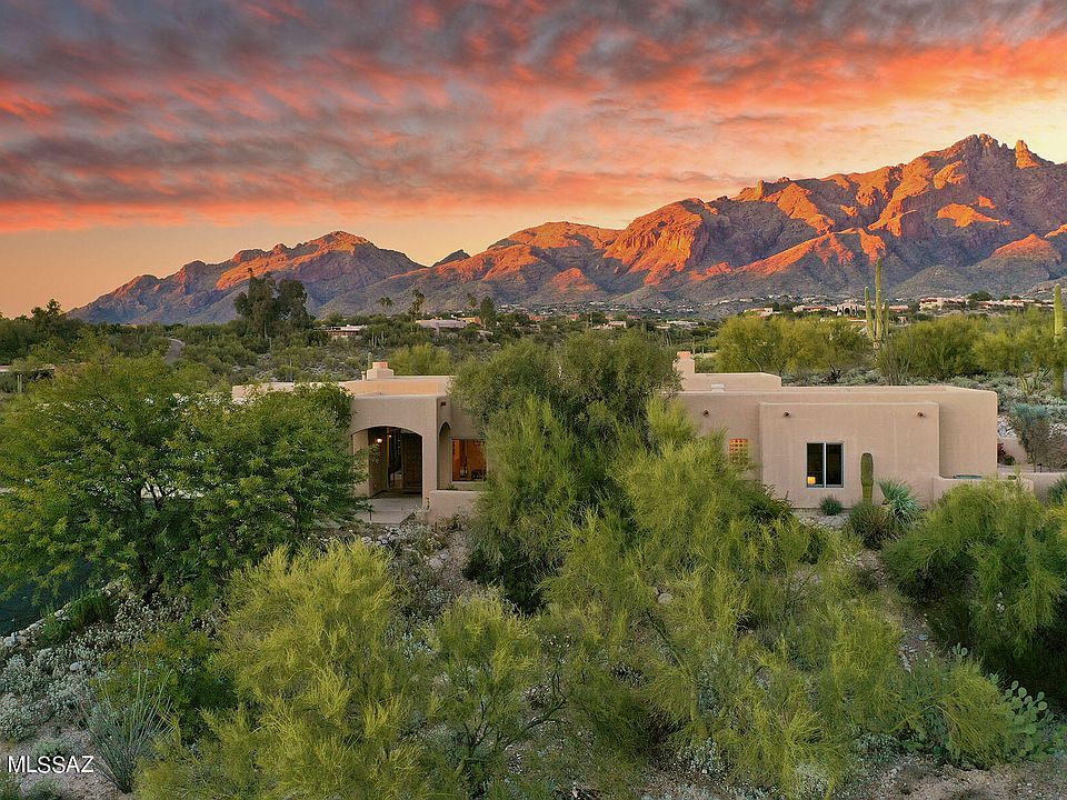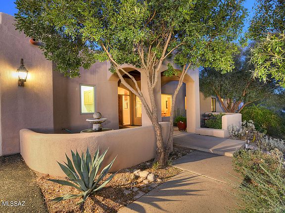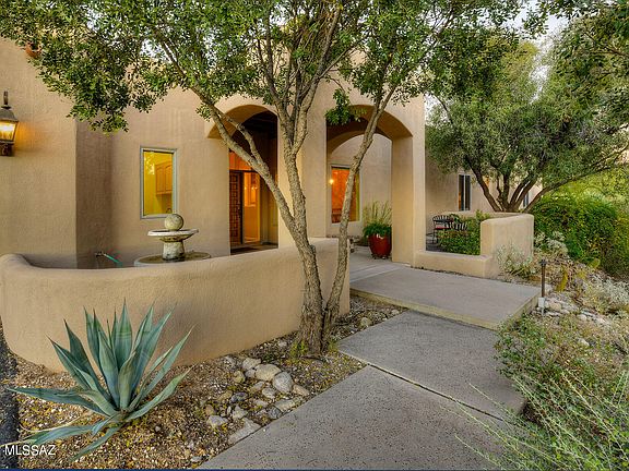 Perfectly located in the Catalina foothills, within a gated community and perched on a hill in a cul-de-sac. This charming home has courtyard entry w/ fountain & city light views. This lovely 4 bedroom 3 full bathroom home enjoys 12'ceilings throughout. Newer, Anderson, dual pane, wood-encased windows, surround sound throughout, Living room with a large picture window framing the beautiful Santa Catalina Mt views. Separate Family room with a fireplace, Formal dining room area, Large eat in kitchen, with tons of storage SS appliances, The Primary bedroom has a fireplace, ensuite bathroom with a walk in closet and private patio. Backyard has a patio w/flagstone,. Extra large 3 car garage w/ tons of storage space.