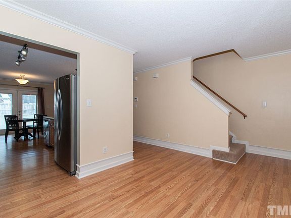 Lovely 4 bdrm home on large fenced lot. New carpet on 2nd level & new tile flrs in baths. Wood laminate flooring on main level. Spacious living rm features a wood burning fireplace, adjoining kitchen offers SS appl's including a built-in microwave & a smooth top stove w/double oven. Breakfast nook has french doors to the oversized patio. Master bedroom has his/hers walk-in closets & a private bath w/dual vanity, garden tub & Sep shower. Enjoy community pool & playground. Conv to I-540 & Triangle Town Ctr