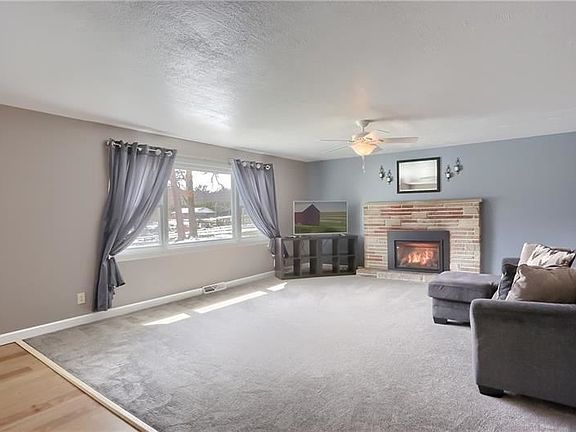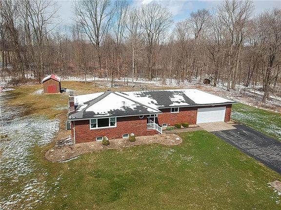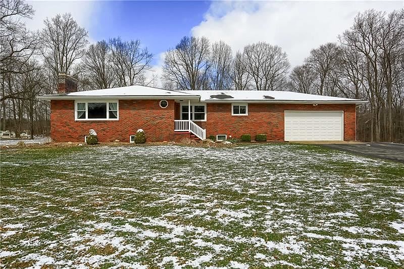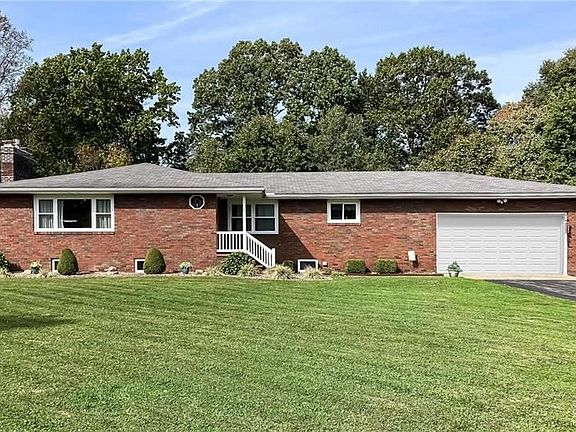 WOW! Brick ranch on 2.5+ acres with modern tones, sprawling modern flooring and an abundance of privacy. Greet guests at the quaint porch and into the open family room with neutral carpet, picture window, ceiling fan and an appealing stone fireplace. Adjacent is a charming dining room with sun filled window. Meal prep and clean is a breeze in the spacious kitchen boasting dark cabinetry, complimenting countertop, custom backsplash and access to the oversized rear deck and yard. Retreat to the primary bedroom with vivid windows, neutral tone, ceiling fan, ample storage and carpet. Let the sunlight greet you in the shared hall bathroom with dual sink vanity, tub/shower combo, and linen closet. Bright guest bedrooms have original hardwood, ceiling fan, and ample storage. Pristine lower level has laundry, full bath, and walk up access leading to the 2.7 acres. Host meals on the rear deck. A shed provides outdoor storage. There is room for everyone to enjoy in and outdoors of this home!