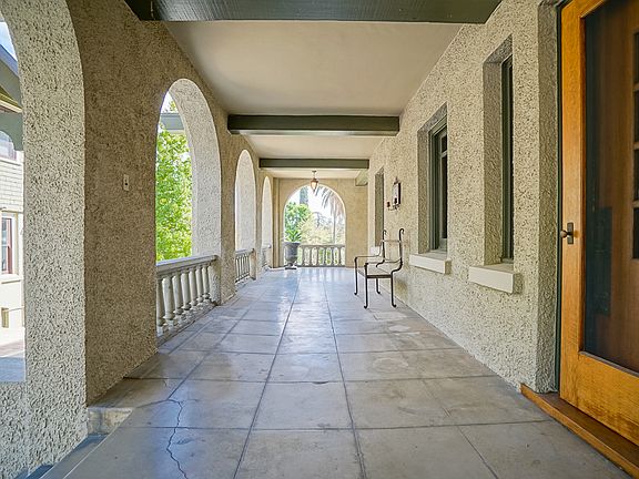 Perched above the street like a beacon, shining its architectural grandeur throughout this historic neighborhood, it's hard to miss the splendor of this Mission Revival masterpiece. Built in 1912 by renowned architect Seeley L. Pillar, now known as the Fred H. Speich House. As you approach you may notice the beauty of the adobe walls and hand thrown stucco while meandering on the enormous wrap around porch. The Mission style front door opens to a music room and a spacious living room. A large fire place is the focal point and can also be seen in the ample sized dining room. The light in these rooms is glorious and creates a magical feeling as the sun passes throughout the day. The interior is filled with Old World Elegance and Craftsmanship of a bygone era, such as quarter sawn oak floors, leaded glass built-ins, and Dentil Moldings. The kitchen has been tastefully upgraded with solid cherry cabinets, flanked with Brazilian granite counters and Viking appliances. The full-size Basement includes a Billiards room, lounge area and half bath. The four bedrooms on the second floor are all spacious with fantastic views, Two have access to the second story wrap around balcony. The ballroom on the top floor (now converted to a library), has 360-degree views. From there you can step out to the roof top, designed to accommodate gardens and get-togethers. Situated in the prestigious Bankers Row of Mount Rubidoux Historic District. A once in a lifetime opportunity to own a piece of history.