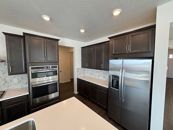 * Stainless steel appliances including refrigerator, stove, microwave, and dishwasher
