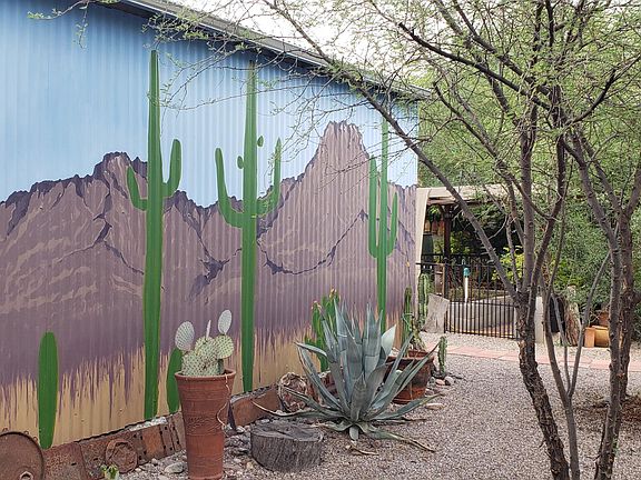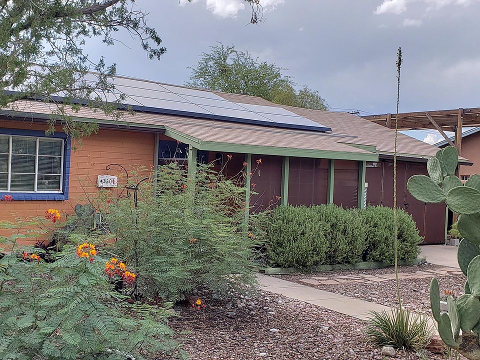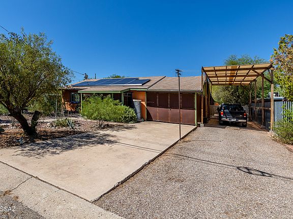 Charming 2-bedroom bungalow featuring artistic touches, set on a spacious lot with privacy. The home boasts tile flooring throughout & ceiling fans in both the living room and bedroom. Kitchen offers ample workspace & cabinetry, along with a cozy dining area. Step out onto a screened, covered patio for outdoor relaxation. The property also includes a large backyard artist studio or workshop, fully equipped with electricity. Indulge in the year-round hot tub and various outdoor spaces for your enjoyment. Solar panels come with the home at no additional cost to the buyer, as do the rainwater collection tanks. A separate laundry room with washer & dryer is conveniently located in a storage area near the garage. Close to shopping, dining, bike paths, and just minutes from UofA & Downtown.
