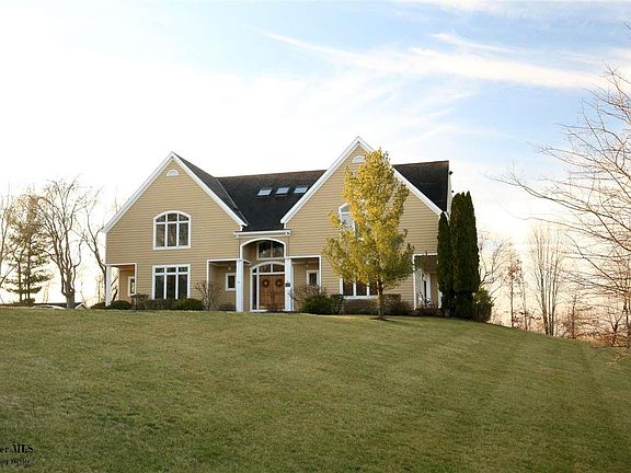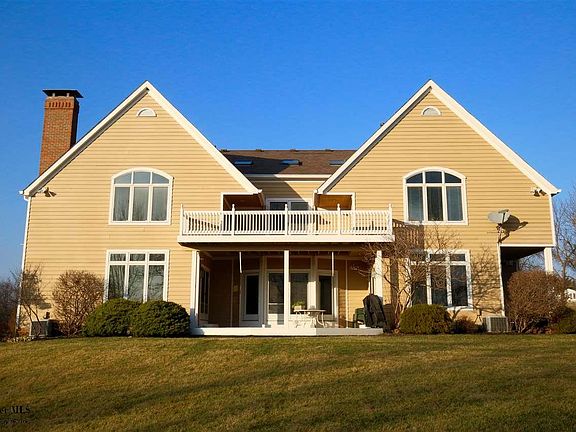 Privacy, location, and amazing views. This custom home built by Mark Friend Builders sits over 1/4-mile from the road atop 21.6 acres on three parcels with two ponds and is only 2 miles from Fairfield Medical Center. Multiple covered porches overlook the property from each floor of the home and in every direction. The home's interior boasts oversized rooms, a large central kitchen, and a great room ceiling that soars 35 feet. Also on the first floor are the huge dining room, private office with exquisite