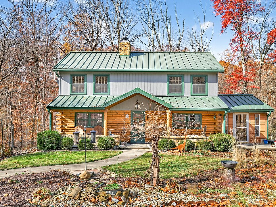Discover rustic hilltop living at this charming log cabin that includes 2 bedrooms, 2.5 baths, featuring a custom second-level bathroom, plus a versatile loft area great for storage or a kids' indoor "treehouse." The open-concept kitchen and dining room provide a functional central gathering space. Enjoy two Brown County stone fireplaces-a wood-burning fireplace in the living room and a second in the lower level ready for a new damper or a fitted ventless gas log setup for added efficiency. The walkout basement offers additional functionality with a family room, full bath and a large partially finished room ideal for hobbies, crafts, a workshop, plus laundry facilities, along with direct access to a large open patio. Additional living spaces include a 3-seasons room overlooking the neighboring lake and a covered front porch. An insulated 2-car detached garage with workshop space, attached carport, and storage shed provide ample space for vehicles, tools, and outdoor equipment. The property is nicely landscaped and set on a quiet country road with convenient access to State Road 45 and Helmsburg Road. Designed for functionality, charm, and comfort, this home offers abundant usable space in a peaceful Brown County setting.