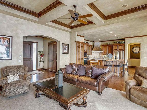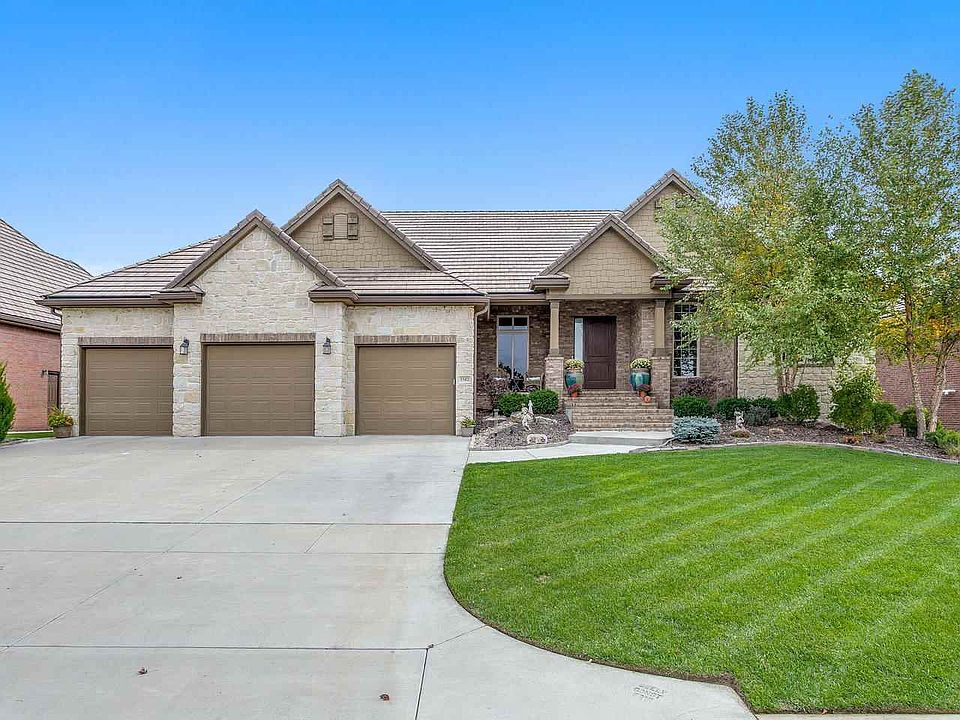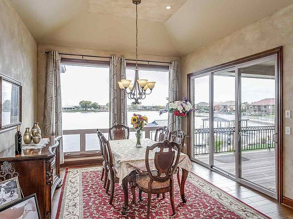 This spectacular lakefront home offers an incredible opportunity to live on a private lake, within a gated community, and enjoy your own beach area and boat dock. Fabulous windows throughout the entire home provide amazing lake views from nearly every room. The open floor plan includes a spacious living, dining and kitchen area with beautiful wood flooring, creating the perfect heart of this home. The living room features a floor-to-ceiling stone wall with mantle for a flatscreen television, built-in cabinets and shelves, and custom coffered ceiling. Enjoy the stunning lake views from the dining area and while cooking and entertaining in the gorgeous kitchen with abundant cabinet and counterspace, large granite island with eating bar space, walk-in pantry with counter-depth shelf, built-in oven and microwave, separate gas range with stylish range hood and beautiful tile inset above the range. The master suite feels like a vacation home at the lake with a huge master bedroom, spa-like bathroom with a custom walk-in tile shower, relaxing separate soaker tub area, two granite vanities, great linen storage, and walk-in closet. The main floor also includes two additional bedrooms, an adjacent bathroom with soaker tub and tile surround, entry drop-zone from the garage, laundry room with wash sink, tile floor and cabinet storage, and half bathroom. The lower level feels like a second main floor with 11' ceilings to offer even more incredible water views. The family room includes a second stone accent fireplace wall, great media viewing area, and room for recreation game tables. The impressive wet bar is perfectly situated to enjoy from the lower level family areas and the outdoor living areas and includes great cabinet storage with granite counter and eating bar, tile floor, full-size refrigerator, dishwasher, built-in microwave, and a stunning lake view to enjoy. The lower level has two additional viewout bedrooms with large walk-in closets, both with adjacent bathrooms - one bathroom with soaker tub and tile surround, granite vanity and tile floor, and the second bathroom with a large walk-in tile shower, granite vanity, and tile floor. The lower level also has a second laundry area and two storage rooms. The exterior features full brick and stone with a tile roof, large covered composite deck, covered walkout area with hot tub and seating area, lush landscaping, invisible pet fence, concrete sidewalk to the sand area, and a newer dock (north half) with a double hip roof, composite decking, covered lift area for boat, and additional uncovered lifts for PWCs. Enjoy this lakeside property offering a lake home lifestyle year around with incredible indoor and outdoor living to enjoy with your family and friends!