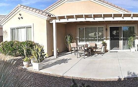 Sun City Palm Desert - Antigua. Located in the newer, northern section of Sun City this home has a south facing rear yard which is elevated over the homes behind it providing an open atmosphere and peekaboo mountain views. The extended cement patio has an alumawood cover and is surrounded by desert landscaping including citrus. Inside, the kitchen has corain counters with rounded edges, overcounter lighting and a breakfast bar. Northern mountain views can be seen from the breakfast nook. Re...