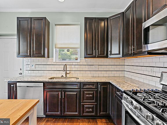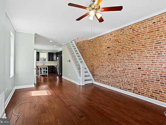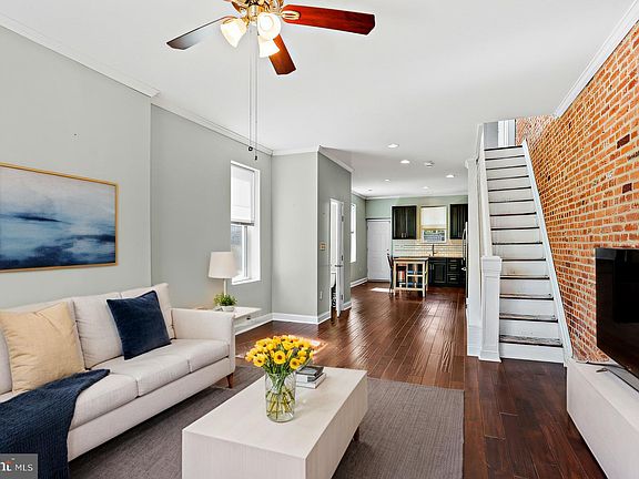 This delightful end-unit 2 Bedroom, 1.5 Bath townhome features a patio and PARKING PAD. As you step inside, you'll be welcomed by beautiful hardwood flooring and an open, airy main level filled with natural light. The living room features plantation shutters, a brick accent wall, and crown molding, enhancing the home's classic character. Adjacent to the living room, the dining area flows seamlessly into the gourmet kitchen, boasting a breakfast bar with storage, granite countertops, subway tile backsplash, and updated stainless-steel appliances, including gas cooking, ideal for preparing home-cooked meals and entertaining guests. From the kitchen, you can easily access the rear patio and parking pad, perfect for outdoor gatherings. Upstairs, the hardwood floors continue, leading to Bedroom 1, which features access to a private deck, creating a cozy outdoor retreat. Another spacious bedroom with a ceiling fan and a full bath with a tub shower combination and tile flooring add to the home's appeal. A skylight floods the center upper level with natural light, a versatile space that can be used as an office, reading nook, or study area. The large basement houses the laundry and offers ample storage space. This home is ideally located near Patterson Park with an abundance of amenities, commuter routes and dining. With its prime location and exceptional features, this townhome is a must-see for anyone seeking a comfortable and stylish living space in Baltimore. Don't miss the opportunity to make this charming property your new home.