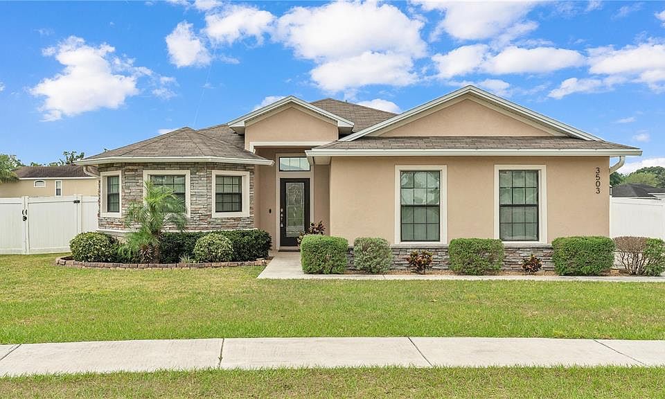 One or more photo(s) has been virtually staged. **PRICE IMPROVEMENT**Introducing this stunning 4 bedroom, 2 bathroom home located in the desirable Oakford Estates neighborhood in South Lakeland. Situated on a spacious corner lot, this home offers both privacy and curb appeal. As soon as you step inside, you'll be greeted by the beautiful wood-look tile flooring that flows throughout the main living areas. The formal dining room seamlessly connects to the spacious kitchen, making it perfect for entertaining guests or hosting family gatherings. The kitchen features stainless steel appliances, an upgraded backsplash, an abundance of cabinets for storage, and plenty of counter space for meal preparation. One of the key features of this home is the tri split floor plan, which offers maximum privacy and separation between bedrooms. The primary bedroom is a true retreat, boasting an ensuite bathroom complete with two walk-in closets, dual vanity sinks, a luxurious garden tub, and a recently upgraded tile shower. On the opposite side of the home, you'll find two additional bedrooms that share a guest bathroom. One of these bedrooms stands out with its custom Disney castle wall and ceiling chandelier. The fourth bedroom is conveniently located across from the primary bedroom and offers stunning views of the expansive fenced-in backyard. With ample space, this fourth bedroom could easily serve as a home office, gym, or playroom. The living room is bathed in natural light thanks to the large windows, creating a bright and airy atmosphere. From the living room, you can step out onto the large custom-built patio, which lends itself perfectly to entertaining guests or simply enjoying a quiet evening outside. Convenience is a highlight of this home, as it is located in close proximity to the Parkway, providing an easy commute to work or access to nearby shopping and dining options. Don't miss the opportunity to make this incredible property your own!