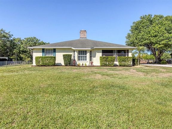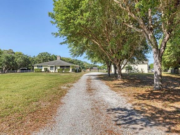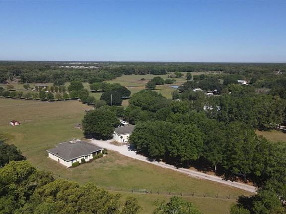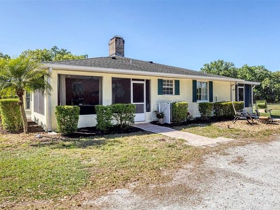 Welcome home to this one level, ranch style home sits on 5 acres lined with lots of gorgeous live oak trees for plenty of shade. NO HOA or Deed Restrictions here! The 3-bed, 2 bath home is an open and spacious concept with a double-sided wood burning fireplace separating the dining and living room areas. Tile throughout with carpet in the master bedroom. Boasting an oversized country kitchen, large island, lots of storage and an abundance of natural light. This home features two screened lanais. Front lanai faces the front yard, perfect for sunrise coffee, the back lanai overlooks the pasture and pond for evening sunsets. Aluminum frame gazebo sits over a standalone 5-person hot tub on a wooden deck that is perfect for quiet evenings or entertaining. Detached 30x40 shop is concrete and frame metal with a 12ft garage door. New Champion two post 9000lbs car lift, 2 -20amp plugs for welders or air compressors inside and also 2- 50amp plugs outside for RV hook ups. Carport and two other small out buildings for storage or animal shelters with water spigots in close range. New interior fence 2.5 years ago. This 5-acre property is a rare find with its County water service and close proximity to shopping and schools and only 27 miles from Gulf Beaches. Please reach out to schedule your showing today.