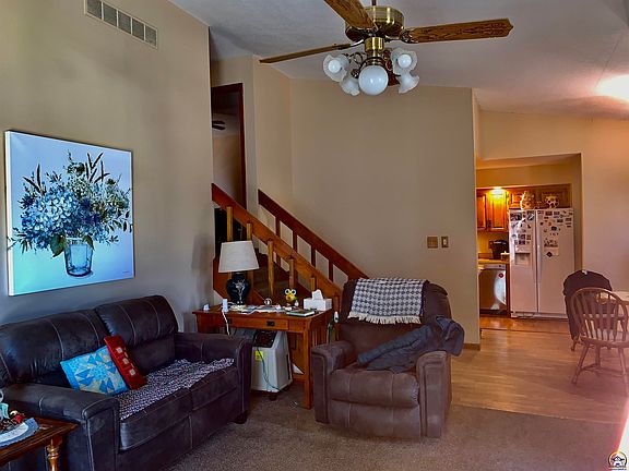 This half duplex is a super cool front to back split. The main level enters into the living room with Vaulted ceiling, fireplace and sliding door to the patio-so nice natural light. To the left is the dining room, kitchen and hallway to a desk or coffee bar and 2 car garage-lots of storage in the kitchen-seating at the bar, stove and refrigerator stay. Upper level offers 2 large bedrooms, hall bath and master with private deck, walk-in closet and double sinks in bath. Lower level features a family room, laundry and storage. Fenced yard with cobblestone steps to the upper back yard.