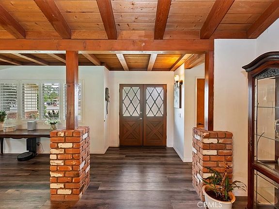 Step through the inviting double-door entry into a stunning family room featuring vaulted wood-beamed ceilings and a massive brick fireplace, perfect for gatherings and cozy nights in. The open floor plan flows effortlessly into the family dining area and a generously sized kitchen, equipped with a stainless steel double oven, 4-burner gas cooktop, dishwasher, and tons of storage space. Enjoy white tile counters and backsplash, a breakfast bar, upgraded LED lighting, and a built-in desk area—ideal for multitasking in the heart of the home.