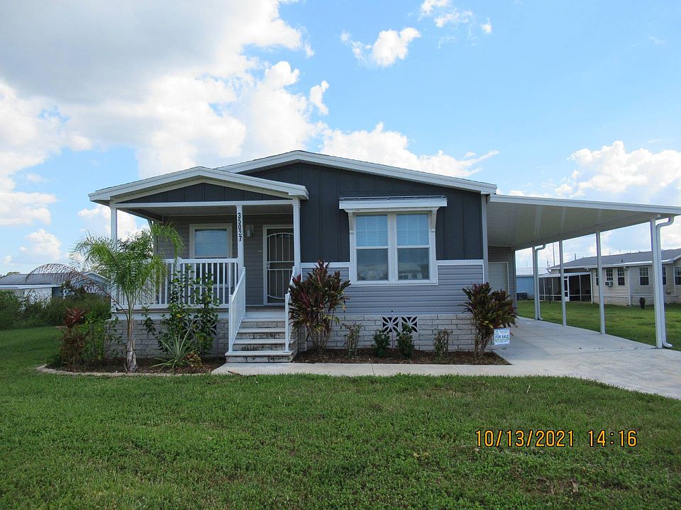 This is a 2019 Skyline home on a perimeter lot. The home has 1271 sqft of year-round living space including three bedrooms and two full bathrooms. The living room, dining room, kitchen and both bathrooms have wood laminate flooring. Everything in this home was new in 2019. Bring your furniture and start living the good life in sunny Florida! The home comes unfurnished. This home is on LEASED LAND with a monthly lot rent of $586.00 in the Crystal Lake community (55+ and pet-friendly). KITCHEN This open-style kitchen has plenty of cabinets and counter space. The large center island has a place for stools and three large cabinets for additional storage space. The all-black Whirlpool appliance package includes a smooth-top stove, side-by-side refrigerator with water and ice dispenser, dishwasher and a built-in microwave. The flooring is a nice laminate and there are six pantry cabinets. DINING AREA (9'6" x 10') Perfect space for your table and chairs. This area has recessed lighting and matching laminate flooring. LIVING ROOM (12'3" x 16') Large-size living room with the same laminate flooring and a ceiling fan. There are windows on two sides and the door leads to the covered front porch. MAIN BEDROOM (12'9" x 14') This good-sized room has carpet on the floor, a ceiling fan and a walk-in closet. MAIN BATH This two-section bathroom has a wide, double-sink vanity with cabinets and drawers below. The walk-in shower has sliding glass doors. The floor is the same laminate. BEDROOM #2 (9' x 10') This room has a wall closet, carpeting and a ceiling fan. BEDROOM #3 (8'3" x 10') Could be a den, office or bedroom (it has a wall closet) if so desired. Solid double-doors close it off nicely from the rest of the home. There is a lighted ceiling fan and the floor is carpeted. GUEST BATH Single-sink vanity with a medicine cabinet, laminate flooring and a tub/shower unit. LAUNDRY Is located near the side entry door. There is a hook-up for a washer and dryer. The floor is matching laminate. COVERED FRONT PORCH (8' x 13'3") Sit back and relax on your rocker and watch the world go by. The floor is 5/4 pressure-treated decking. EXTERIOR The home has vinyl siding. The Grand Aire HVAC unit and the asphalt-shingle roof were new in 2019! The driveway holds three cars with two under the carport. The attached golf-cart shed is 8' x 10'. It has an electric garage door opener and a window AC unit. There is an 8' x 11'6" covered concrete patio behind the shed. Crystal Lake is a very active 55+ manufactured home community in Zephyrhills. Pets are welcome (30 lb. max). The park has a clubhouse, beautiful, shaped pool in a tropical setting, shuffleboard, bocce, billiards and a fitness center all located next to the lake. The lot rent for this home is $586.00 per month. There is an additional pass-through tax of $20.10. Lawn mowing is included. All listing information is deemed reliable but not guaranteed and should be independently verified through personal inspection by appropriate professionals. American Mobile Home Sales of Tampa Bay, Inc. cannot guarantee or warrant the accuracy of this information, measurements or condition of this property. Measurements are approximate. The buyer assumes full responsibility for obtaining all current rates of lot rent, fees, and pass-on costs. Additionally, the buyer is responsible for obtaining all rules, regulations, pet policies, etc., associated with the community, park, or home from the community/park manager. American Mobile Home Sales of Tampa Bay, Inc. is not responsible for quoting of said fees or policies.