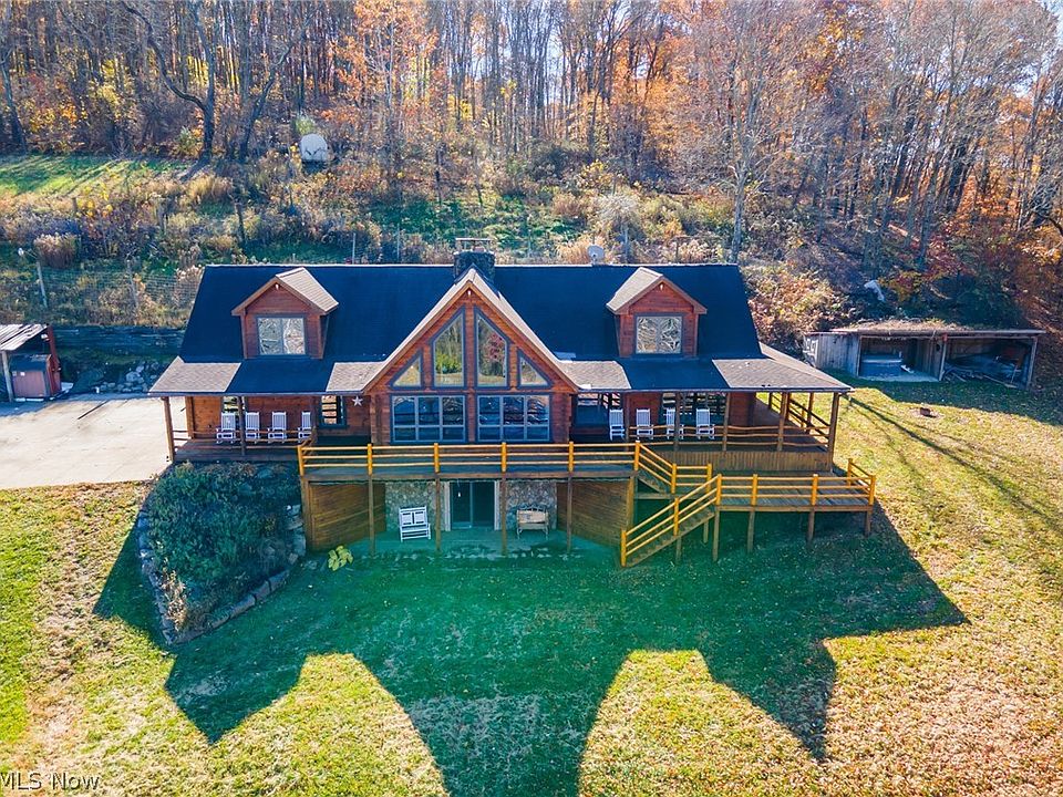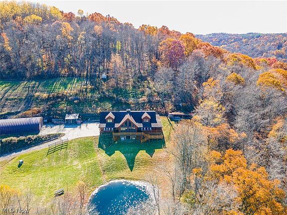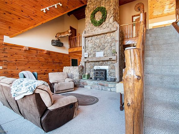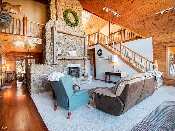 Custom-built log home on 17 acres! This beautiful hillside setting overlooking the wooded valley and pond will stun you! Stepping into the great room your met with cathedral ceilings, a stone floor to ceiling, woodburning fireplace, with waterfall feature and stunning views. The kitchen offers a large center island with tons of countertop space, large dining area and electric stone fireplace. Down the hall you'll find the spacious master bedroom with walk-in closet, updated master bath and sliding glass doors leading you to the wrap around porch. A generous sized bedroom, full bath and laundry room completes the first floor. The second floor boasts a large loft area, 3 sizable bedrooms and full bath. The lower level has even more finished space including a family room with another stone, woodburning fireplace and sliding glass door leading to patio. Large recreation room with stone wall and mantle, bedroom with walk-in closet, full bath, utility room. Outside offers just as much! Enjoy