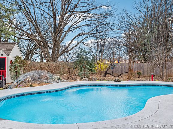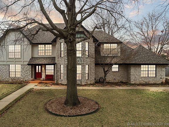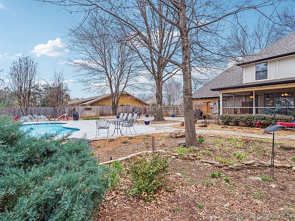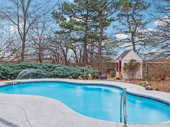 Get away from it all without packing a bag! A gorgeous pool highlights this extraordinary backyard that is a 4 season oasis for young and old with easily maintained gardens, old growth trees and plenty of lounging, pet and play space on a half acre lot. Nestled in the heart of south Tulsa and Jenks school system this 4 bedroom has multiple large living spaces and a kitchen designed by Kitchen Ideas. A two level foyer opens to a dramatic staircase and cozy office. With French doors and built-ins the office is positioned well for remote working or separate media or music space. A formal dining room is also well positioned to work as a flex space if needed. The large family room with fireplace spans the back of the house and opens to the spacious renovated kitchen with catering pantry, prep island, double ovens, 6-burner gas range top, Craftmade cabinets, and nook that easily accommodates furniture for dining with family and friends. With a focus on outdoor living the space flows seamlessly to the screened porch, pool and multiple patios surrounded by lush landscaping that offers year round interest and yet is easily maintained. There is an additional hobby room on the first level with built in desk. The vaulted main bedroom suite has wood floors, sitting area and updated spa styled bath. Three additional bedrooms are spacious with large closets & access fully updated pullman bath. A huge game room has both media and game table space. Oversized garage with shelves cabinets. Easily accessible attic storage. Owens Corning 50yr roof installed in 2016. State of the art pool equipment designed for low maintenance w/ filter cartridge pump UV light cleaner Oxidizer.