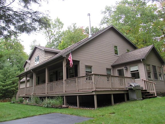 This is a gorgeous, custom built home with shared private access to Higgins Lake. Why pay the high property taxes when you can own your own piece of paradise just steps away from Michigan's premier lake? There are only 5 homes off the water here in The Lake View Association. This one could be yours! And...this home includes full dock and boat mooring. Yes, you will have your very own private slip! Even the boat hoist is included! This home features an open floor plan with skylights and a solid oak railing to guide you up to the loft and upper level. There is an extra large bonus room over the finished garage which could be a great game room or extra sleeping area. The kitchen is just perfect with large custom cabinets and stainless steel appliances. There are granite counter tops too.