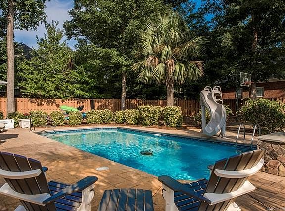 Hard to find! 5 Bedroom, 3 full Bath full brick home with gorgeous salt water pool with slide & water fountain Great curb appeal with sideload garage with built in storage, wooded lot, & rocking chair front porch. Main floor office, Guest suite w/full bath, & formal Dining Room. Open kitchen with plenty of storage, pantry, Corian counters, tile backsplash, upgraded cabinetry, recessed lighting & flows into 2-story Great Room with fireplace. Hardwoods throughout most of home! 6 ft privacy fence, fire pit, & basketball court! New pool heater & salt water generator,