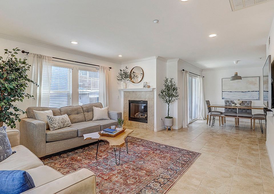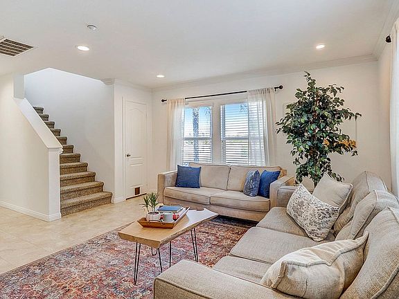 Beautiful end unit - move in ready! Tile and carpet floors, granite countertop, crown molding, and lots of natural light. Great layout with a balcony deck off the dining room, attached tandem two car garage. Features include Air Conditioning, fireplace, lots of storage, stainless steel appliances, laundry room, recessed lighting throughout, even in the bedrooms. The complex has a pool, hot tub, clubhouse, and a kids play area. Low HOA fee & Security gates!