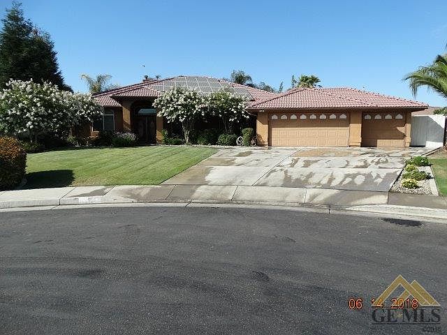 CUSTOM Built. 7 bedroom 5 bath home with 3700 est. square feet with SOLAR so virtually NO electric bills. Located on quiet Cul-de-Sac and features include: Beautiful swimming pool,alarm system,3-car garage w/ roll-up drive thru door,corner fireplace, gourmet kitchen with huge center island granite and stainless steel,3 suites with own bathroms,formal dining,huge master suite,basketball court,water softener,art alcove,digital entry door lock,custom patio door and dual custom entry doors,huge rear lawn area,2 sheds,lots of fruit trees,outdoor shower,firepit,Den/office,wet bar,covered patios,custom windowscomplete outdoor BBQ cook center,surround sound system,water feature in rear yard,Dual Heating and air units,Breakfast bar,tiled floors and so much more. No other home in the area is like this one. This home is perfect for large families with 7 bedrooms. Seller has much more invested in this custom home that listing price and is a rare find in Bakersfield. Buyer to verify all.