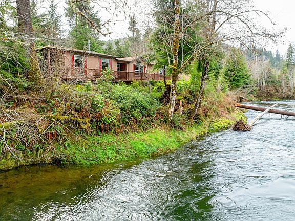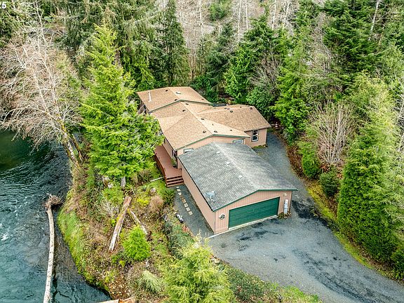 Impeccable, single-level riverside oasis! Listen to the sounds of the water rippling by daily as you enjoy views of the river and mountains from nearly every window. So many features to love both inside and out. Wrap around deck, stone patio, open floor plan, large walk-in pantry, gas cook top, built-in ovens, floor to ceiling riverstone fireplace! An extra-deep double car garage with a workbench and a whole house generator for those stormy winter nights we have on the coast!