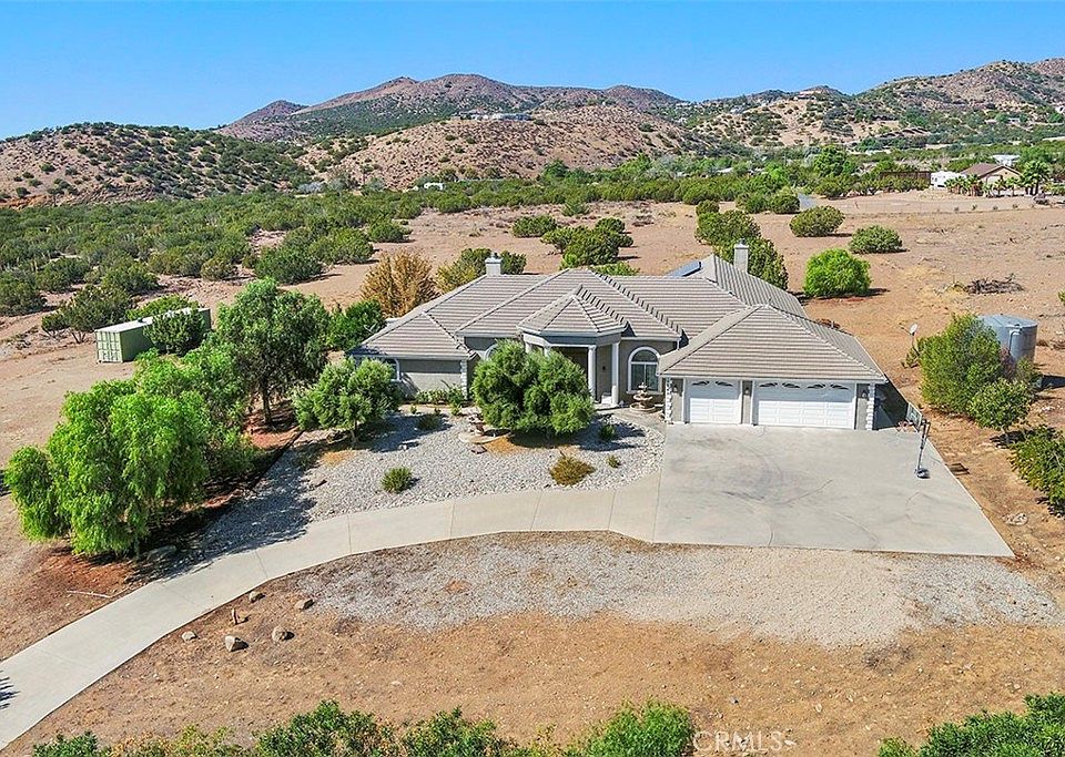 Custom Estate property built in 2006. Original owner builder and first time on market. 4 bedroom and 5 baths. Guest bedroom with en-suite bathroom. Featuring double door entry, high ceilings and huge master retreat with sitting area, 2 sided fireplace, wet bar and enormous bathroom with oversized walk-in shower and soaking tub! Toilet and a bidet too. Situated on just over 5 flat acres, this property is a true gem. Gourmet kitchen with walk-in pantry, double ovens, built in microwave and so much more. Formal living room with french doors open to the covered patio. Oversized formal dining room. Family room with fireplace. Jack and Jill bath. 2 guest baths. Private and secluded, views of the valley and nearby mountains. Outside spiral staircase leads to a flat area on the patio roof. Great for star gazing. Owner owned solar system. Wet bar. Large indoor laundry room. Covered patio area. 3 car garage too! Come for a Visit. Stay for a lifetime. Welcome home!