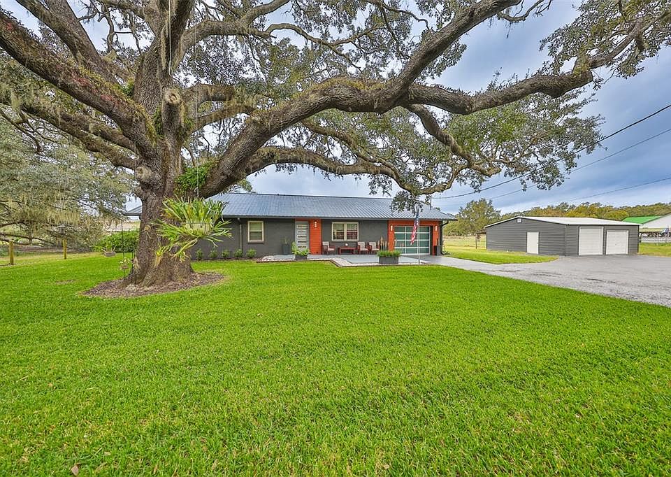3/2 Pool home on your own Private Country Estate is framed by a beautiful grand oak. An exterior electric gate welcomes you to this fenced 1-acre Plant City property with podocarpus privacy hedges. Bring your toys and enjoy the detached additional 2 car garage with workshop and an RV hookup. Walk through the stainless steel entry door to an updated interior with a chef's kitchen featuring wine fridge, range with range hood, quartz counters, and eat-in area with modern chandelier. The kitchen is the heart of the home and gives great views of living room and pool. The open floor plan is spacious, well-lit and features a french door exit to your private screened-in lanai with concrete pool. Host your backyard barbecues in your fenced yard, perfect for spreading out and entertaining. Each bedroom in this home is spacious and the master bedroom features on en-suite bathroom with jetted tub. Up-to-date renovations include hand planed cypress plank accent on the front of the house, a new metal roof (2022), newer drain field (2020), newer a/c (2020), new glass garage door (2021), crown molding, recessed lighting, newer paint throughout, updated lighting and so much more. *1% INTEREST RATE REDUCTION for the first 12 months by our approved lender, call for details.*