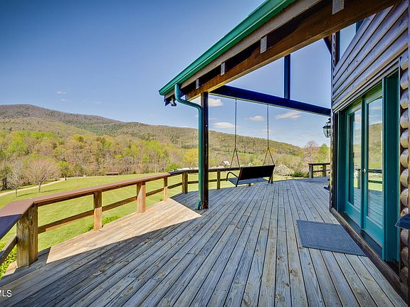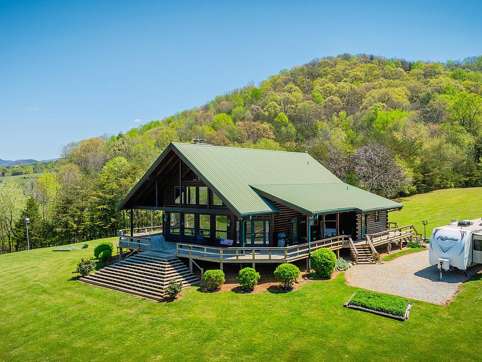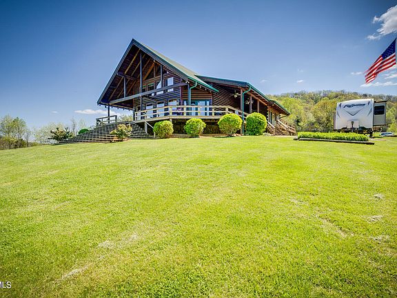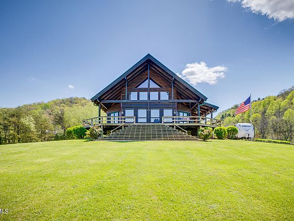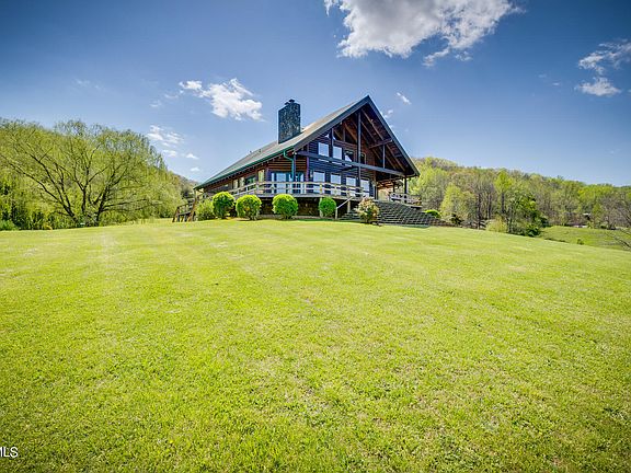 Beautiful 5420 sq ft custom built log cabin sitting on 10.69 acres with ornamental gates as you enter the property. Expansive mountain views from your wrap around deck. On the main level you will find that the living area has floor to ceiling windows and exposed beam 24' vaulted ceilings, stone wood burning fireplace with a rustic multi tiered mantle. Kitchen has island, gas stove, and custom cabinetry. Also on the main level is the primary bedroom featuring an ensuite bath that has both a stand up shower and a clawfoot tub, walk in closet with built-ins, & a screened in porch. Laundry/mudroom and sunroom all on main as well. Walk up your split log staircase into your loft/library/office space that has tons of built ins and overlooks the main level. You will also find your second primary bedroom with ensuite bath, walk in closet, storage room, and private balcony. Down in the walk out basement, you will see a large finished game room/den, along with a full bath, a 264sq ft secret room, & an oversized 2 car garage. Outside there is a 500 gallon in ground owner owned propane tank, a 50amp service & Septic dump station (near the flagpole) for your RV. The 2 story 21x60 outbuilding has its own leased propane tank, has power, water, and heat, with 2 garage bays (one is 13.6ft tall to fit an RV), 1260 sq ft on the main level, 800 sq ft on second level. High Speed Xfinity available. Furniture is negotiable. Sunroom or basement areas can easily be converted into extra bedrooms if needed. See survey: Lot 1 has an address, lot 2 has an address, water meter, and a septic permit. Close proximity to waterfalls (Dudley, Kelly, & swimming Hole), hiking & horse trails, Meadow Creek Lookout Tower & Trails, Public gun range, Viking Mountain, trout/fly fishing, Paint Creek Corridor, Nolichucky River Dam. 1+ hour to Pigeon Forge, Gatlinburg, Dollywood, Knoxville, Asheville, 3-airports. Do not drive up driveway without an appointment. Buyer/Agent to confirm all information here-in.