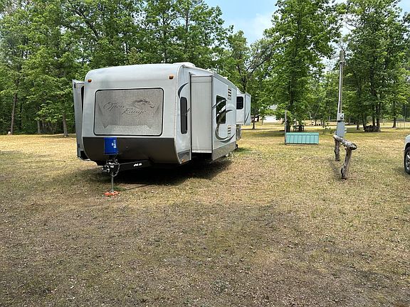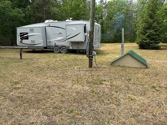 Your up north escape is here! Beautiful 5 acres fully wooded with mature trees and a nice groomed trail for afternoon walks. Located right in a popular ORV area and easily accessed right on a county maintained road. Property has power on site as well as a beautiful 34 foot 2012 Open Range Travel Trailer that is in immaculate condition. Camper is set up and ready to go and comes ''move in'' ready! Site has two 50 amp plugs and one 30 amp plug and the site is cleared and very clean. Nice sized storage shed with block foundation is great for storage and keeping things locked up. If you want something ready for the summer and easily maintained you should check this one out! Well on property does not function and needs to be replaced per the seller.