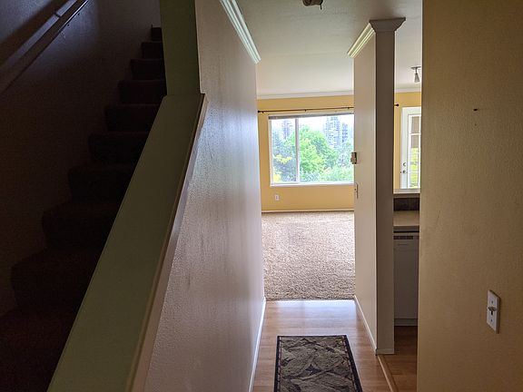 Two bedroom, 1.5 bath near OHSU/PSU. End-unit townhouse. One dedicated parking spot. Door in living room opens to large deck suitable for outdoor table/chairs and plants. Views of south waterfront and Mount Hood. Washer/dryer in unit. Rear of property overlooks mature forest. Adjoins walking/jogging path with direct access to OHSU campus. Walk to OHSU campus, Under Armour headquarters/Duniway Track public exercise field, PSU, aerial tram and south waterfront. Walk score 82; transit score 77; bike score 70. Storage unit at carport included. No pets. Includes water/sewer, garbage/recycling. No smoking.