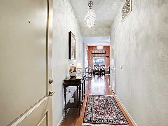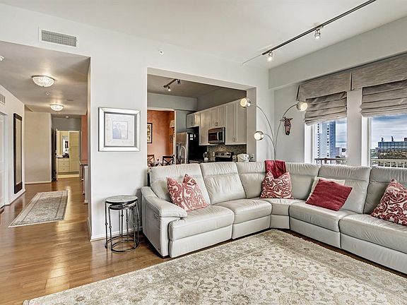 Stunning north and east views of the Galleria and downtown from this 15th floor luxury high rise. Open floor plan features light filled living room with large corner balcony. Granite island kitchen with stainless appliances and bonus beverage/wine cooler. This lovely 2 bedroom 2 full bath condominium offers upscale designer light fixtures, custom Roman shades, blackout draperies, energy efficient honeycomb/cellular shades and laminate wood flooring. Primary bedroom faces east for beautiful morning sun. En-suite bath has granite countertop, double sinks, tub/shower combination and marble surround. Guest bedroom or study with wall of open and closed storage. 2nd bath with granite countertop and glass shower. Full size washer and dryer. Condo includes 1 car garage and 1 assigned parking space. Amenities: pool, grills, well equipped gym, dry sauna, meeting room, business center, valet parking and concierge.