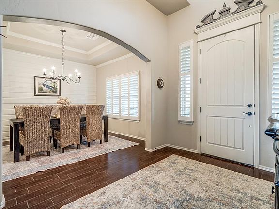 The formal dining room impresses with elegant shiplap detailing and a tray ceiling, ideal for hosting dinner parties or holiday gatherings.