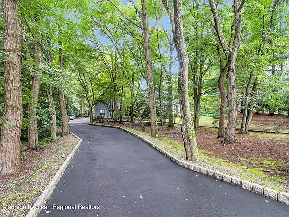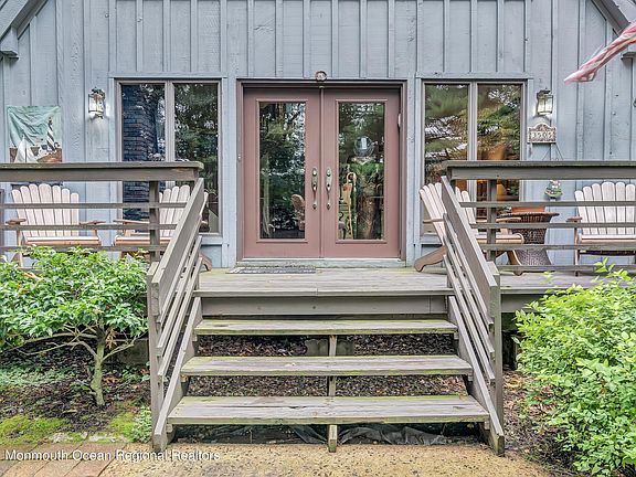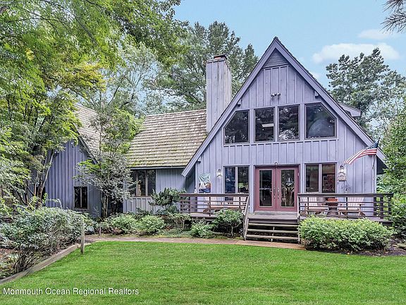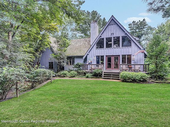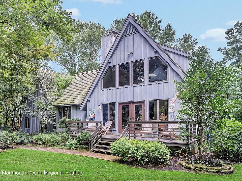 Long, secluded driveway leads you to this very unique Colorado A Frame Ski House set in the woods of Wall Twp. Top floor hosts the master suite with 2 walk in closets, a cedar closet and 2 built in's. First floor hosts 2 bedrooms 2 full baths, an open kitchen concept with dining area off the side. Overlooking a large family room with a wood burning stove. Spacious living room w/ a 2 way brickface wood burning fireplace also facing a formal dining room. There's nothing like the sound and smell of a crackling fire in the winter! Full finished basement w/ 2 bedrooms, full bath. Sitting on over an acre, a completely private oasis awaits you in the backyard. An inground pool and a beach volleyball court with decking surrounds the entertainment areas.