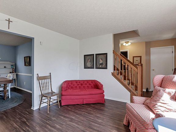 Great Curb Appeal & Well Maintained Updated 2Story Home w/ 1,800 Sqft including Finished Lower Level. Covered Porch leading to Foyer with Closet & Updated Half Bath. Adjacent Front Living Room into Dining Room flowing into Kitchen with Breakfast Bar, Black Appliances, Under Cabinet Lighting & Dinette Area. Family Room has New Carpeting and Ceiling Fan. Sliding Glass Door off Rear to Concrete Patio, Fenced Yard with Fire-pit, Shed & Beautiful View of Trees. 3 Bedrooms Upstairs including Owners Suite with Double Closet & Private Updated Bathroom. Finished LowerLevel Living Quarters including Utility Area with Sink with Washer & Dryer Conveying. Updates: Gutters '10, Roof '12, HVAC '13, Plank Floors '19, Half Bath '19, New Microwave, '20, Carpet '22. Community Park & Close to OSU. No HOA.