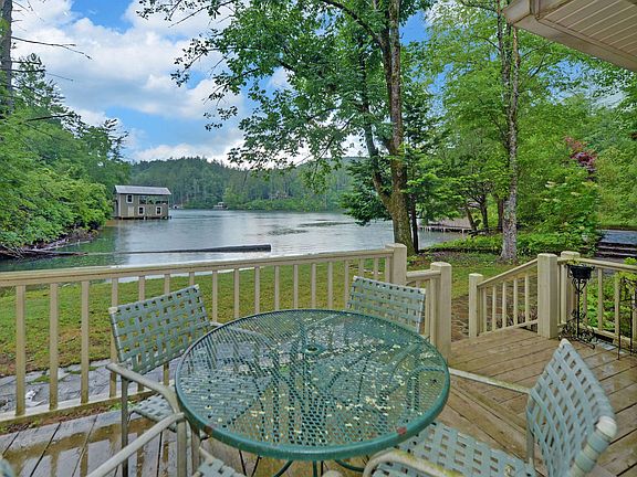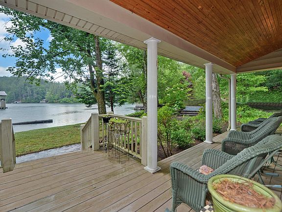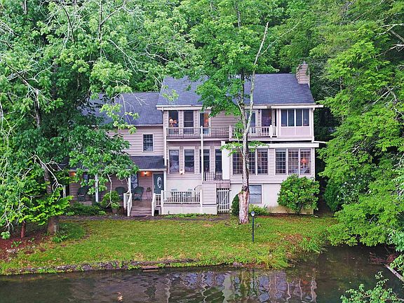 Enjoy beautiful sunset views with over 300' of lake frontage as you listen to the sounds of a babbling creek and from this 4 bedroom, 3.5 bathroom waterfront home! Tucked in a small cove, with mature landscaping, this home is spacious and well constructed but does need some TLC. As you approach the home from the gated, concrete driveway, you'll pull into a two-car garage. Step inside and up a small flight of stairs to the main living area that includes a large kitchen with a fireplace, stainless steel appliances, hardwood floors and generous cabinet space; a welcoming living room with fireplace and a door leading to a sunroom with spectacular lake views! Also on the main floor, you'll find a laundry room and half bath. Upstairs from the main living area, you'll find the private master suite complete with fireplace and a second lakefront sunroom that's the perfect spot for your morning coffee or to moon gaze. In addition to the master bedroom, you'll find a guest room with private bathroom and an office on this level. On the garage side of the home, on the upper level you'll find two additional guest bedrooms with a shared bath and small kitchenette. Outside, the level, grassy lawn leads directly to the lake waterfront. A landscaped footpath leads to the 2-stall, 2-story boathouse. Enjoy completely paved access from HWY 441. This property is located approximately 20-25 minutes from Downtown Clayton and approximately 10-15 minutes from the amenities in Lakemont including the Lake Rabun Hotel and Restaurant.