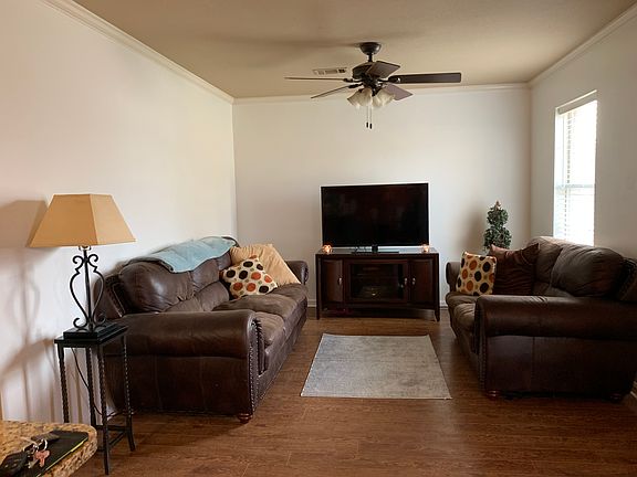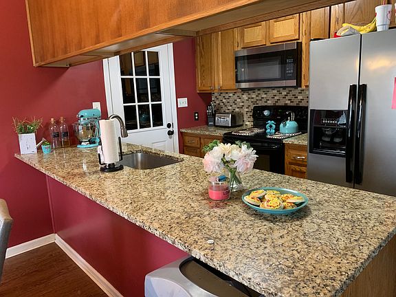 Great 3 bedroom, 2 bath first home! New microwave and dishwasher included. New flooring in living room, dining area and hallway. Must see! Won't last long. Beautiful back yard with mature shade trees with wooden privacy fence. Awesome 2-tier deck in back. Lots of room for the kids to run around. Rustic walkway with fire pit has unique lighting underneath the white rocks. Doggy door connected to garage. New granite countertop in kitchen, refrigerator is not included! Granite in both baths. 2 car garage with extra large storage room. Call today for your private showing!